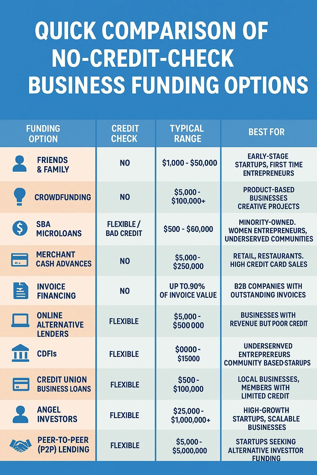 If traditional no-credit-check loans aren't suitable, consider these alternatives specifically designed for entrepreneurs with limited credit: